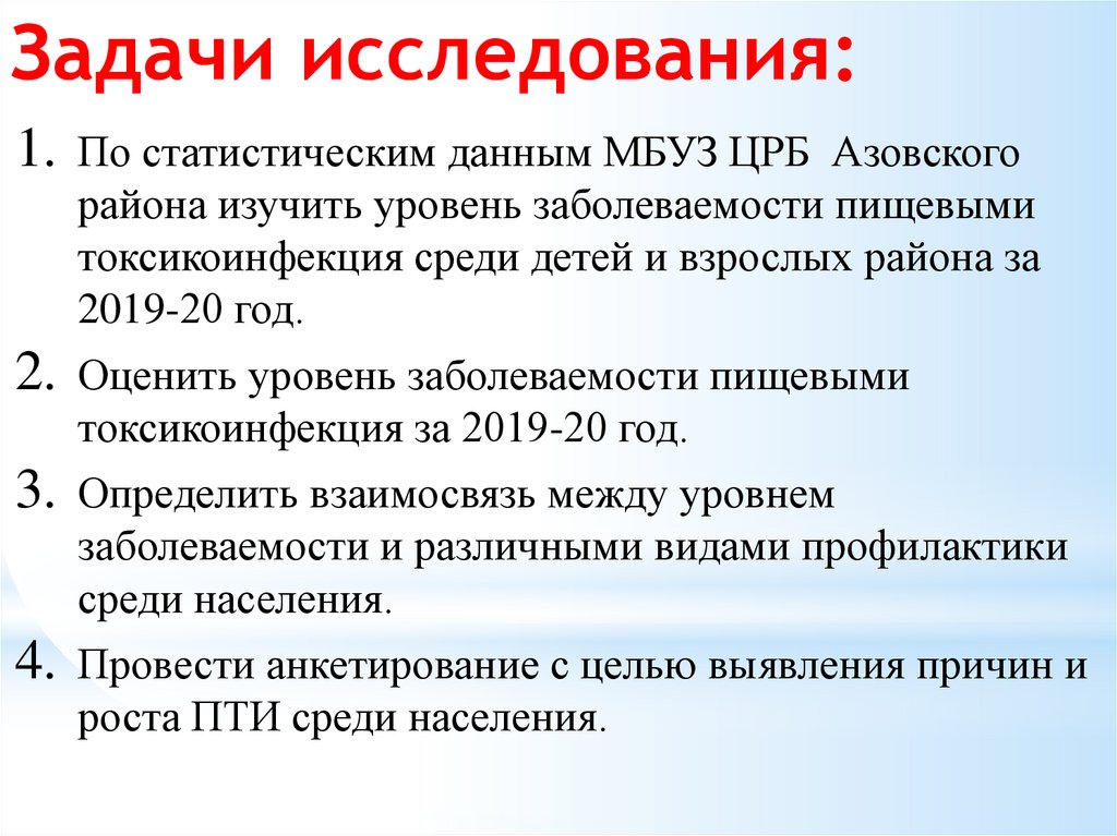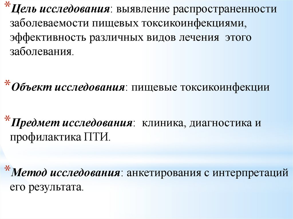*Цель исследования: выявление распространенностизаболеваемости пищевых токсикоинфекциями,