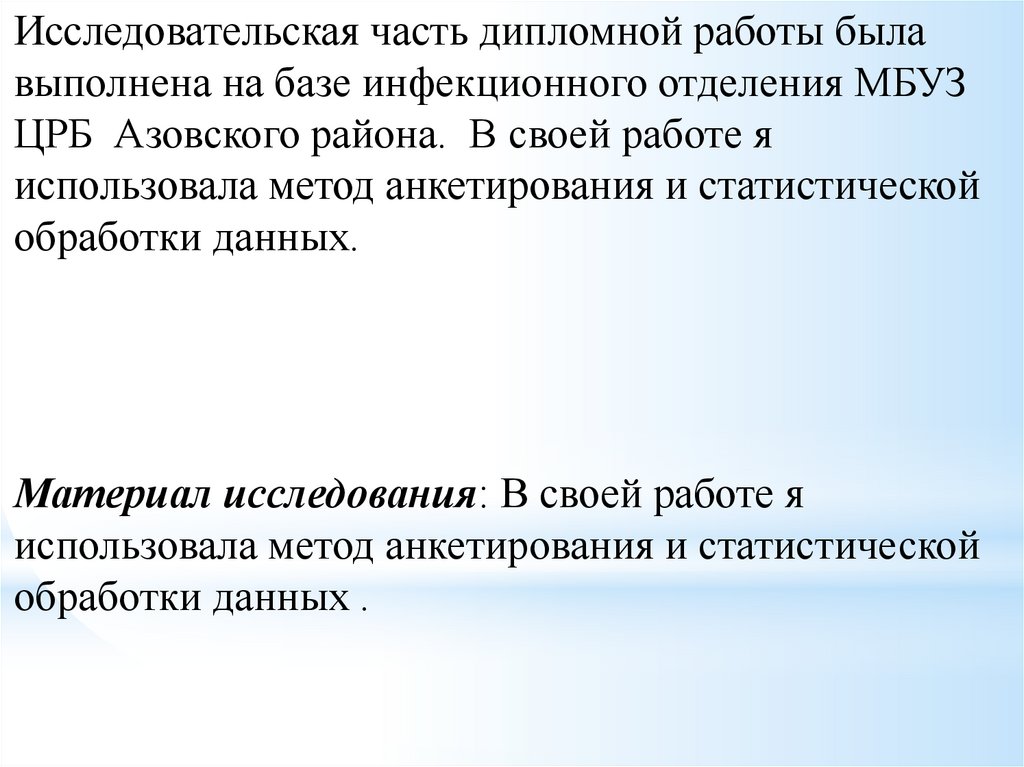 Исследовательская часть дипломной работы былавыполнена на базе инфекционного отделения МБУЗ