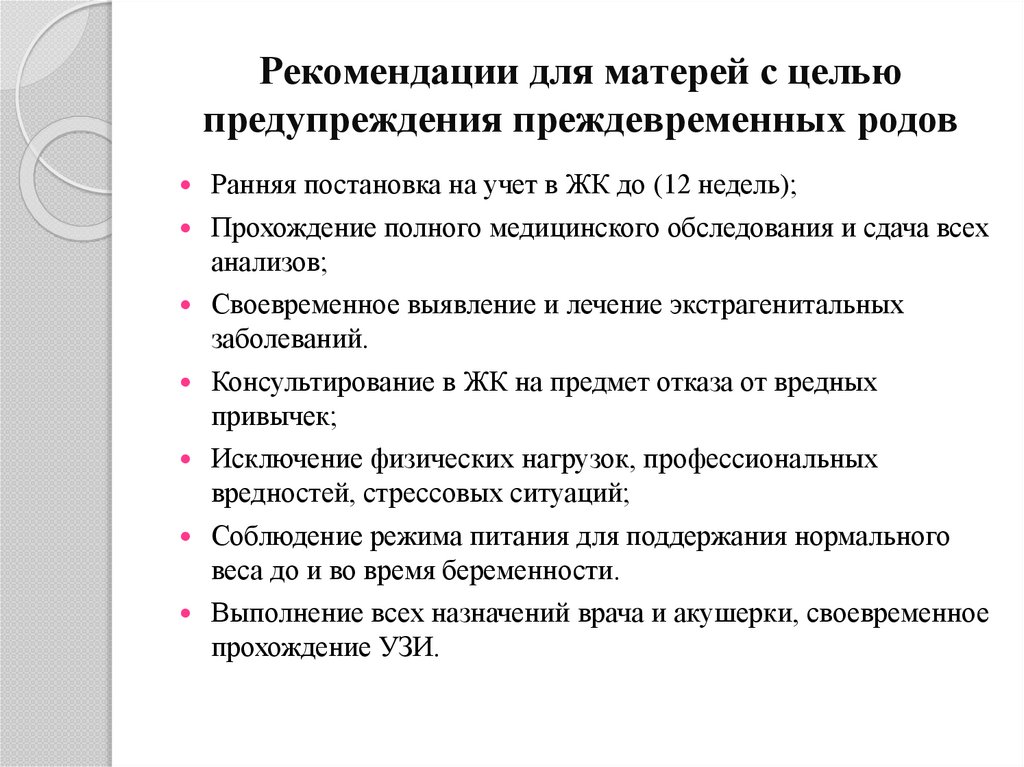 Рекомендации для матерей с цельюпредупреждения преждевременных родов