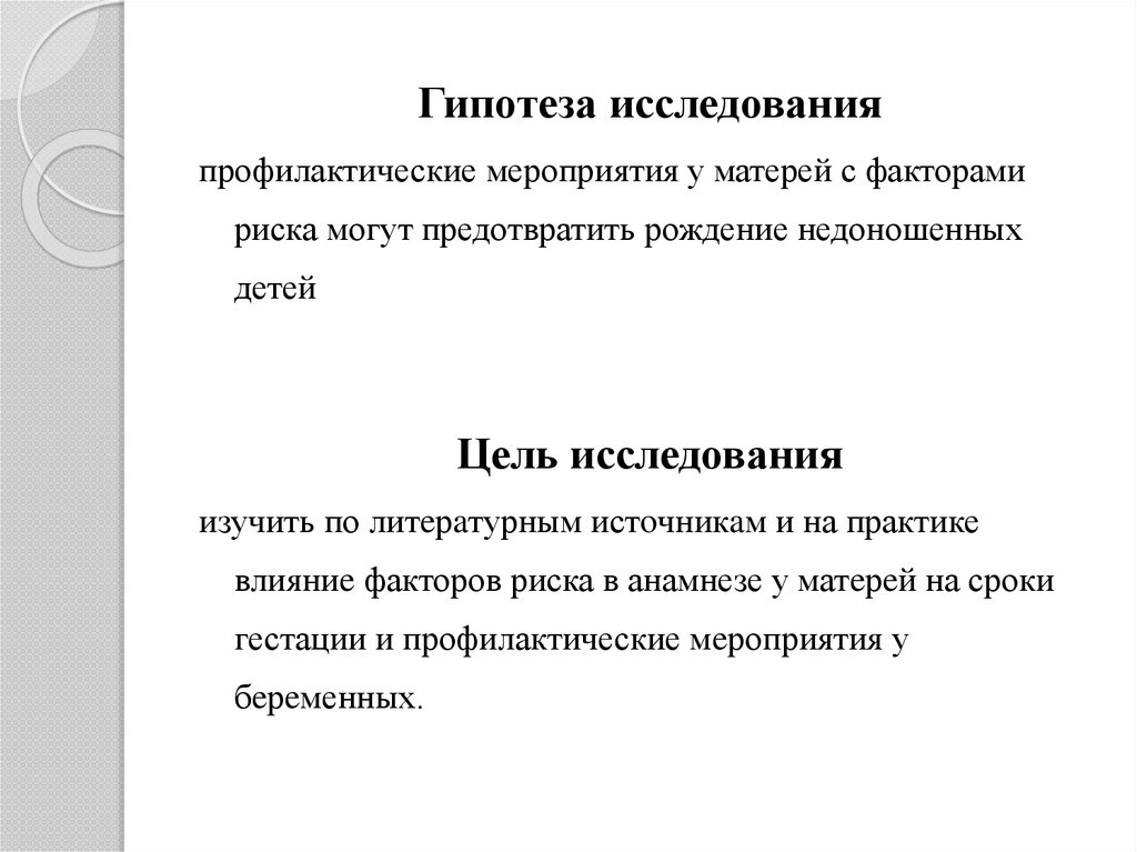 Гипотеза исследованияпрофилактические мероприятия у матерей с факторами