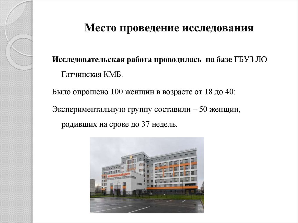 Место проведение исследованияИсследовательская работа проводилась на базе ГБУЗ ЛО