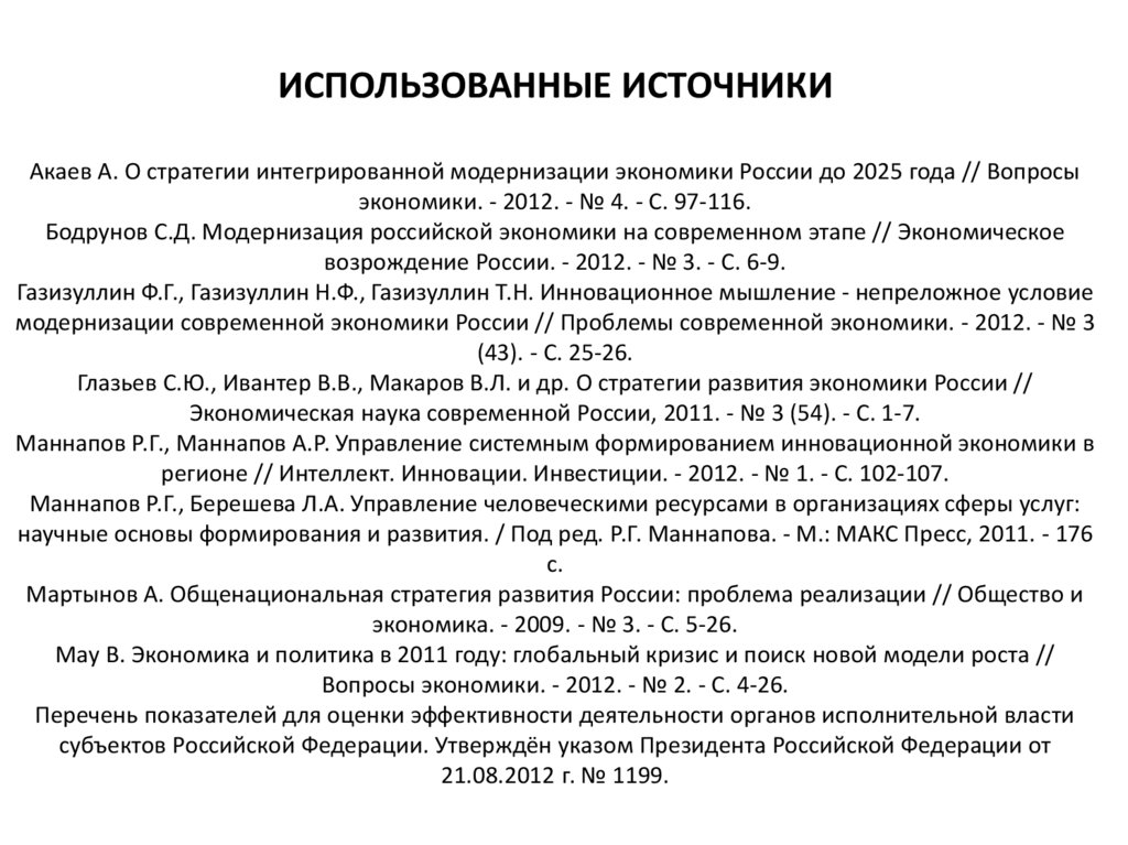 ИСПОЛЬЗОВАННЫЕ ИСТОЧНИКИАкаев А. О стратегии интегрированной модернизации экономики России до 2025 года // Вопросы