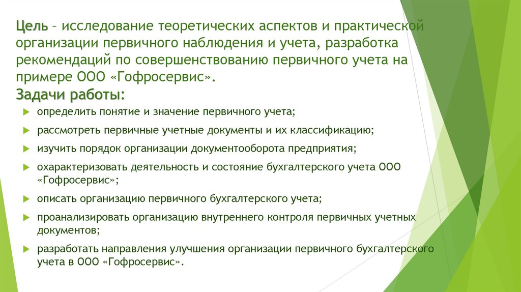 Цель – исследование теоретических аспектов и практическойорганизации первичного наблюдения и учета, разработка