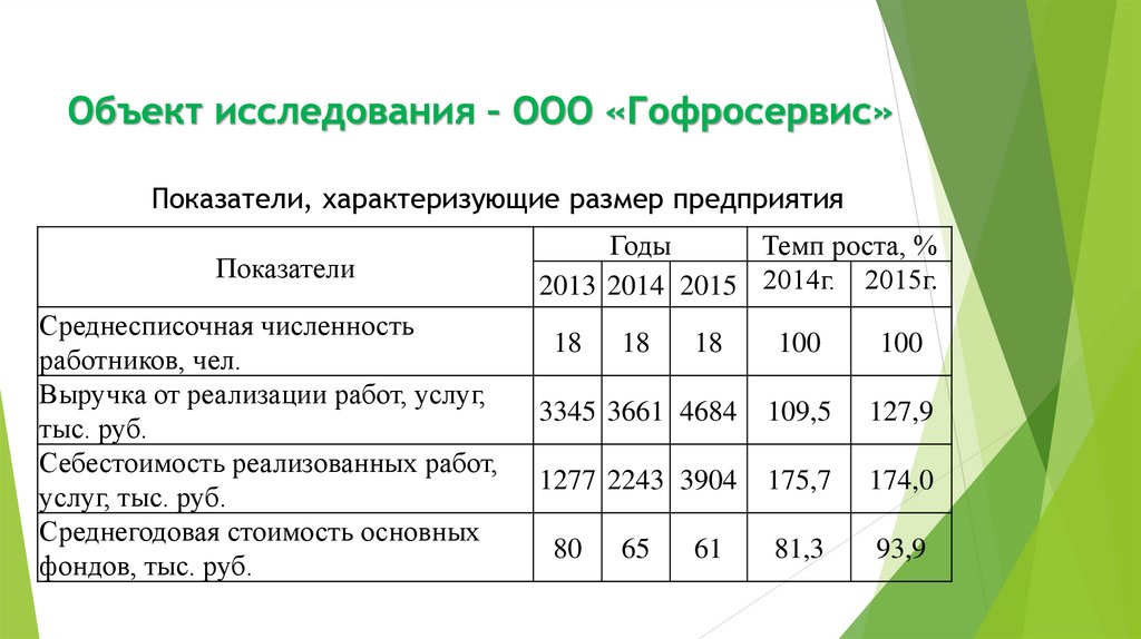 Объект исследования – ООО «Гофросервис»Показатели, характеризующие размер предприятия
