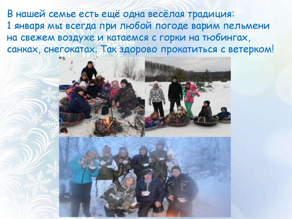 В нашей семье есть ещё одна весёлая традиция:1 января мы всегда при любой погоде варим пельмени