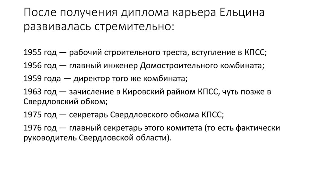 После получения диплома карьера Ельцинаразвивалась стремительно: