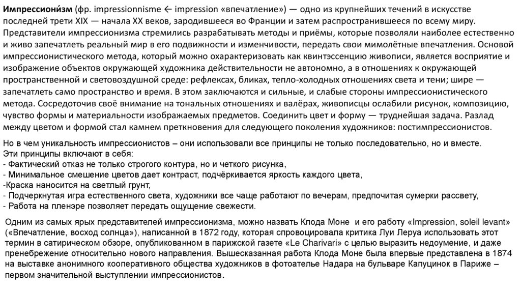 Импрессиони́ зм (фр. impressionnisme ← impression «впечатление») — одно из крупнейших течений в искусствепоследней трети XIX — начала XX веков, зародившееся во Франции и затем распространившееся по всему миру.