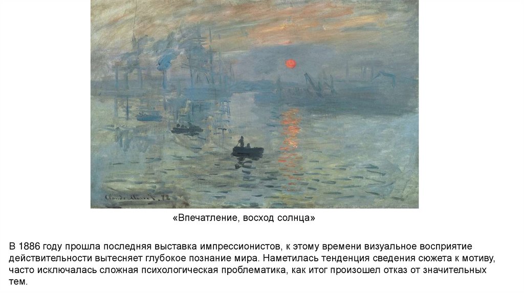 «Впечатление, восход солнца»В 1886 году прошла последняя выставка импрессионистов, к этому времени визуальное восприятие