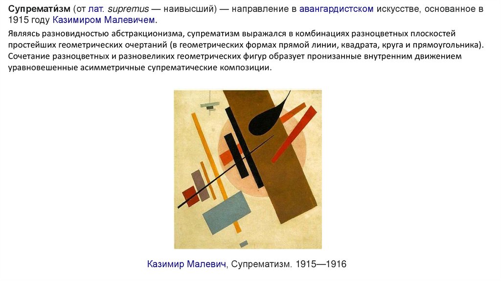 Супремати́зм (от лат. supremus — наивысший) — направление в авангардистском искусстве, основанное в1915 году Казимиром Малевичем.