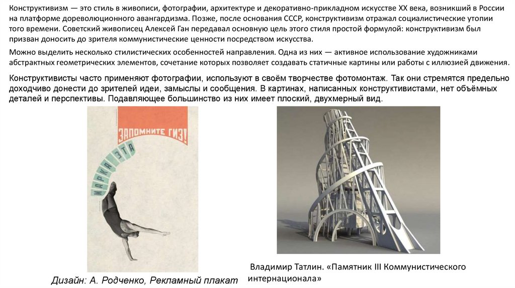 того времени. Советский живописец Алексей Ган передавал основную цель этого стиля простой формулой: конструктивизм был