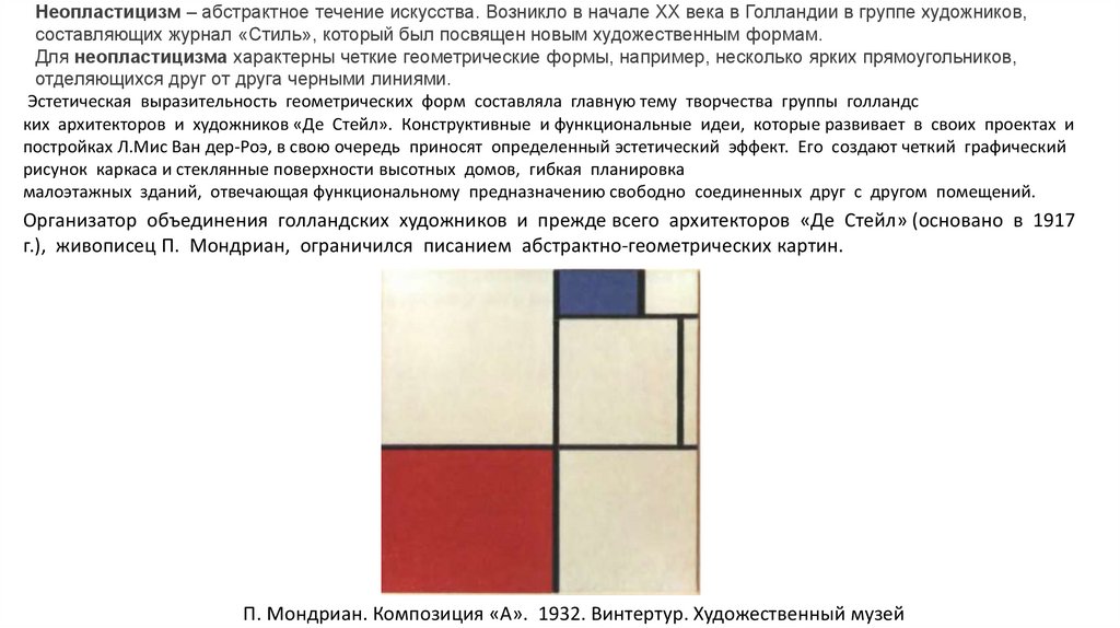 Неопластицизм – абстрактное течение искусства. Возникло в начале XX века в Голландии в группе художников,составляющих журнал «Стиль», который был посвящен новым художественным формам.