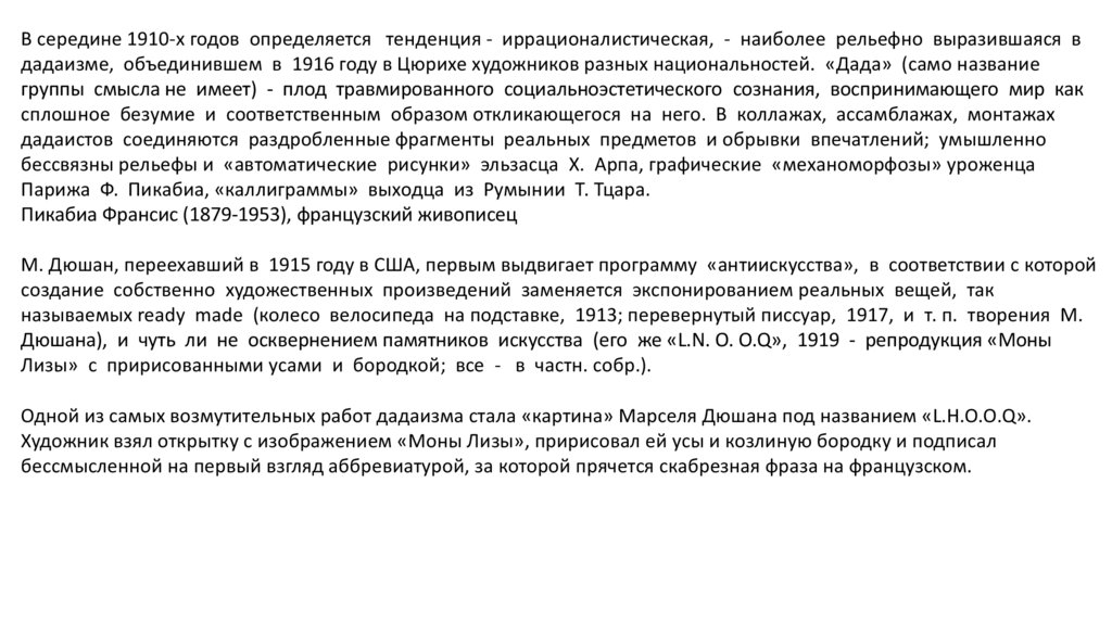Дюшана), и чуть ли не осквернением памятников искусства (его же «L.N. О. O.Q», 1919 - репродукция «Моны