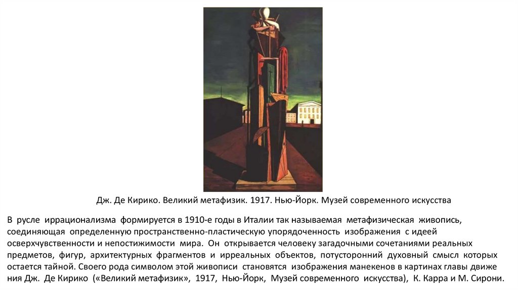 ния Дж. Де Кирико («Великий метафизик», 1917, Нью-Йорк, Музей современного искусства), К. Карра и М. Сирони.