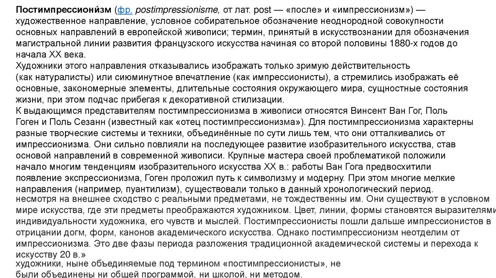 отрицании догм, форм, канонов академического искусства. Однако постимпрессионизм неотделим от