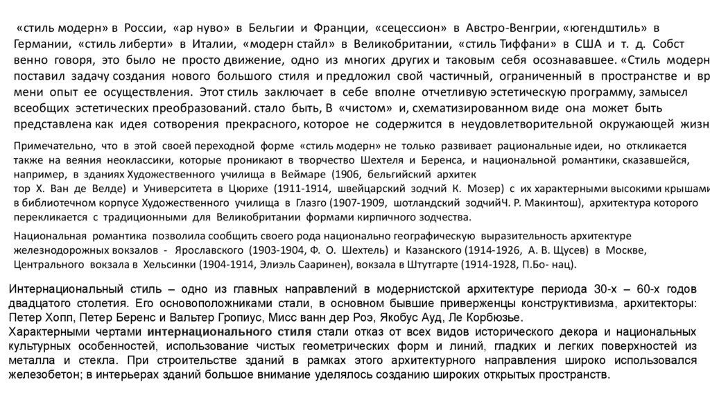 «стиль модерн» в России, «ар нуво» в Бельгии и Франции, «сецессион» в Австро-Венгрии, «югендштиль» вГермании, «стиль либерти» в Италии, «модерн стайл» в Великобритании, «стиль Тиффани» в США и т. д. Собст