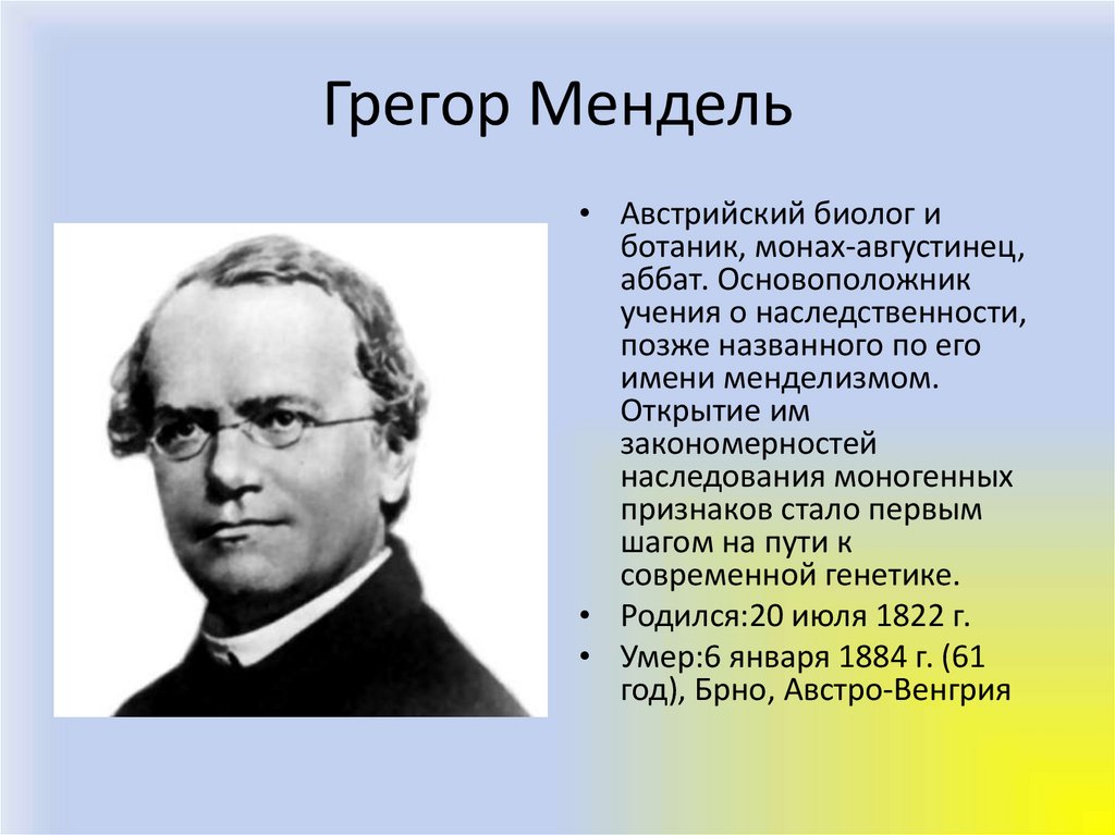 Грегор Мендель• Австрийский биолог и