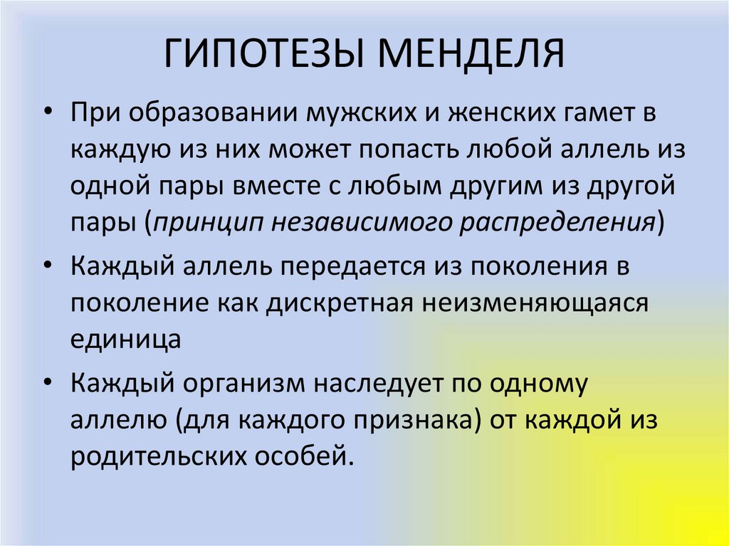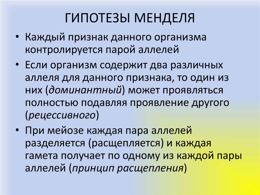 ГИПОТЕЗЫ МЕНДЕЛЯ• Каждый признак данного организма