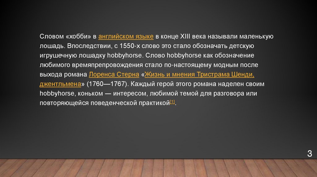 Словом «хобби» в английском языке в конце XIII века называли маленькуюлошадь. Впоследствии, с 1550-х слово это стало обозначать детскую