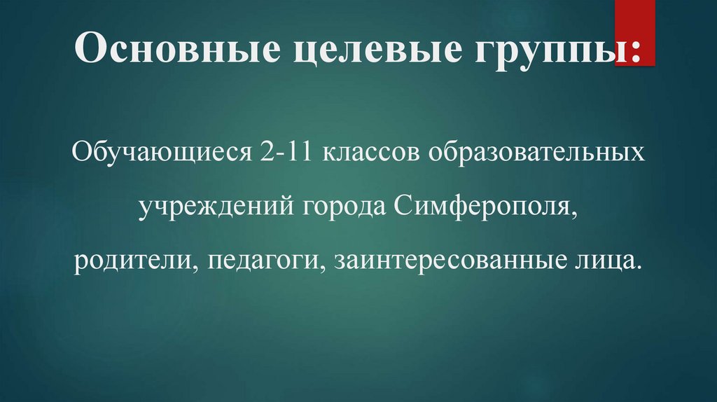Основные целевые группы:Обучающиеся 2-11 классов образовательных