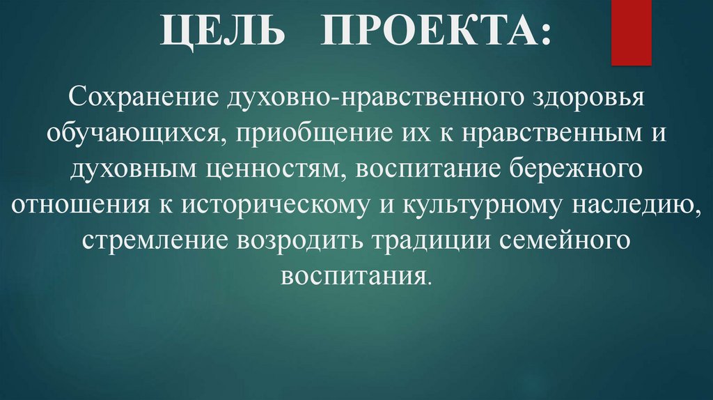 ЦЕЛЬ ПРОЕКТА:Сохранение духовно-нравственного здоровья