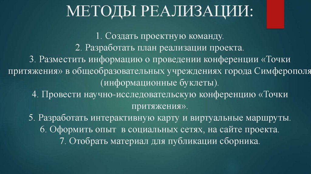МЕТОДЫ РЕАЛИЗАЦИИ:1. Создать проектную команду.