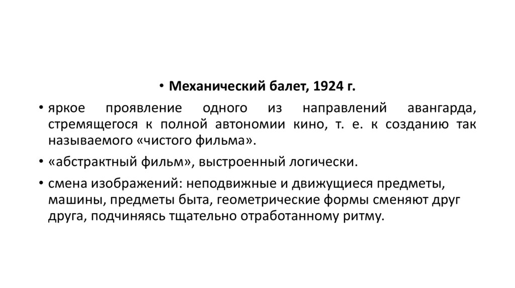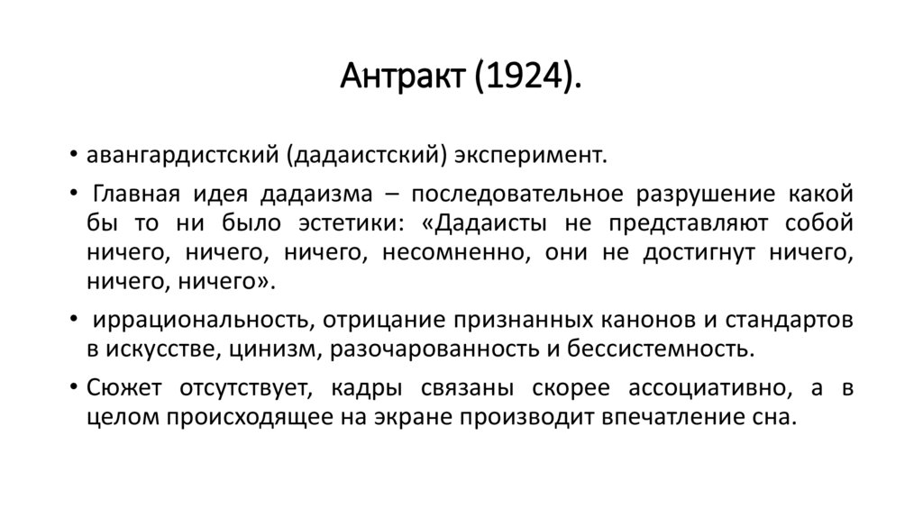 • Сюжет отсутствует, кадры связаны скорее ассоциативно, а в