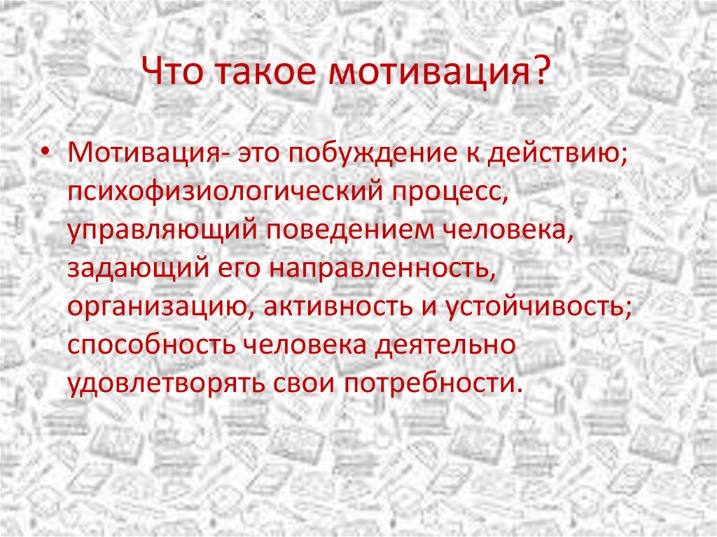 Что такое мотивация?• Мотивация- это побуждение к действию;