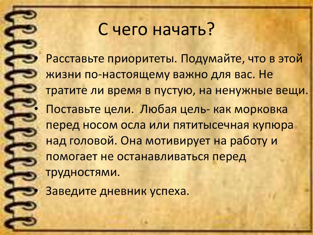 С чего начать?• Расставьте приоритеты. Подумайте, что в этой