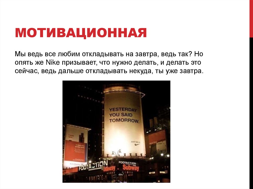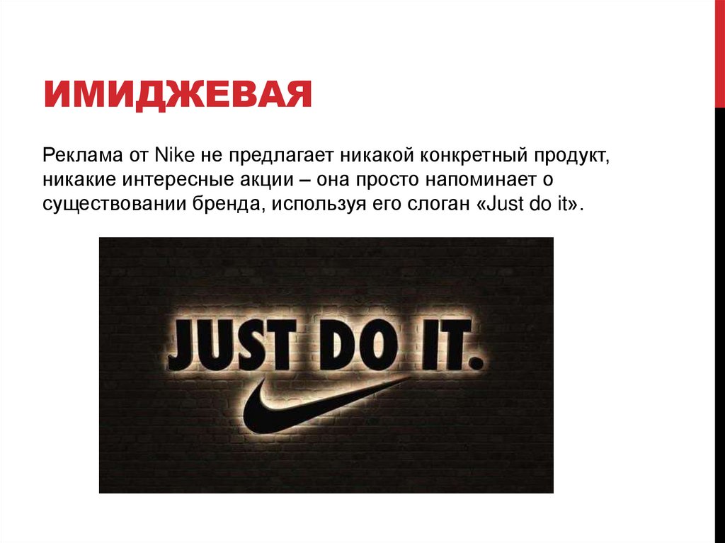 ИМИДЖЕВАЯРеклама от Nike не предлагает никакой конкретный продукт,