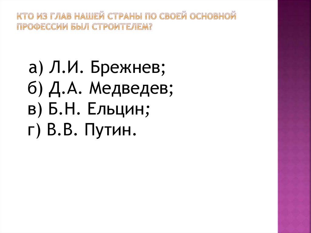 а) Л.И. Брежнев;б) Д.А. Медведев;