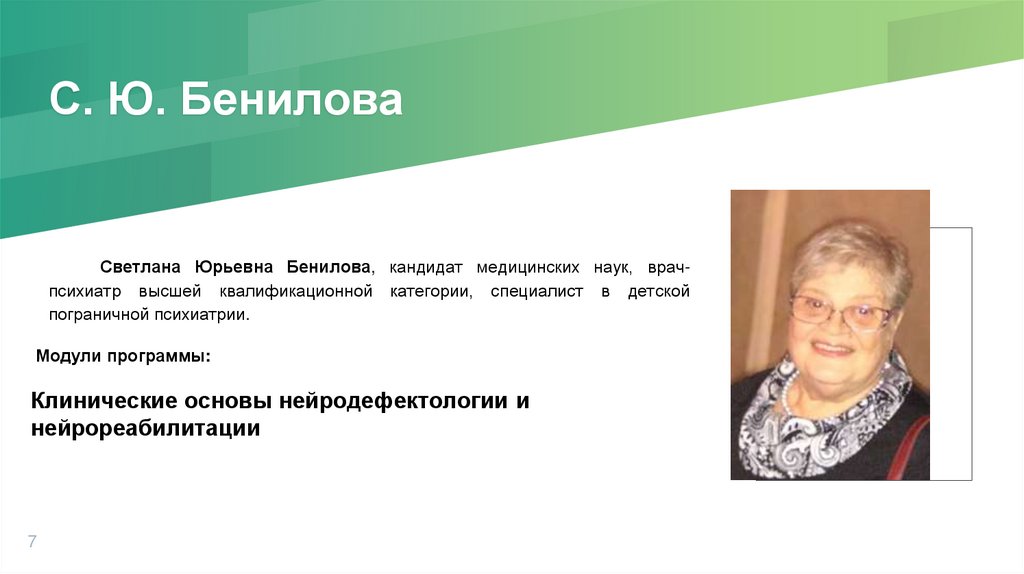 С. Ю. БениловаСветлана Юрьевна Бенилова, кандидат медицинских наук, врачпсихиатр высшей квалификационной категории, специалист в детской