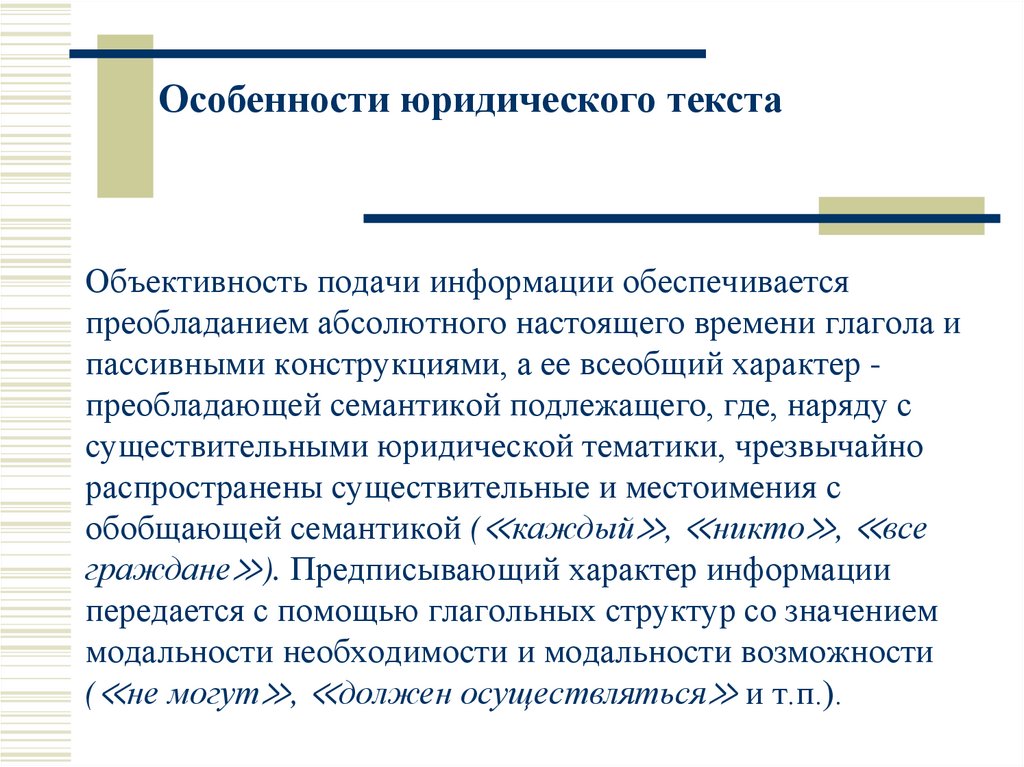 Особенности юридического текстаОбъективность подачи информации обеспечивается
