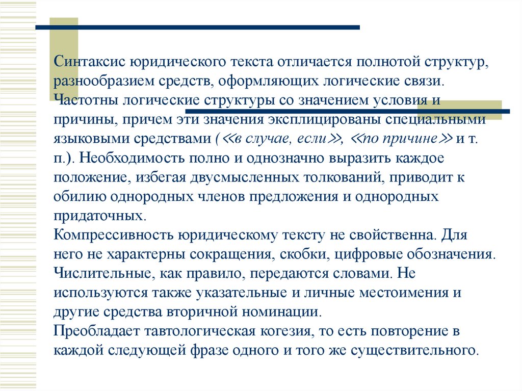 Синтаксис юридического текста отличается полнотой структур,разнообразием средств, оформляющих логические связи.