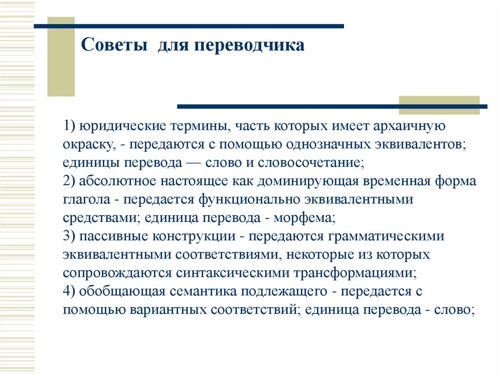 Советы для переводчика1) юридические термины, часть которых имеет архаичную
