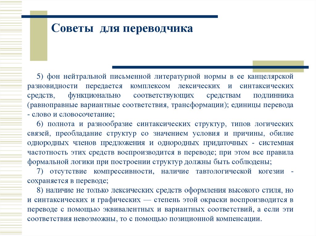 Советы для переводчика5) фон нейтральной письменной литературной нормы в ее канцелярской