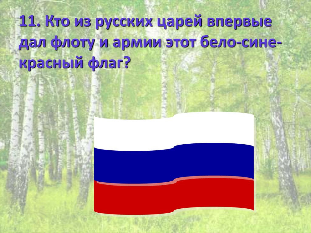 11. Кто из русских царей впервыедал флоту и армии этот бело-синекрасный флаг?