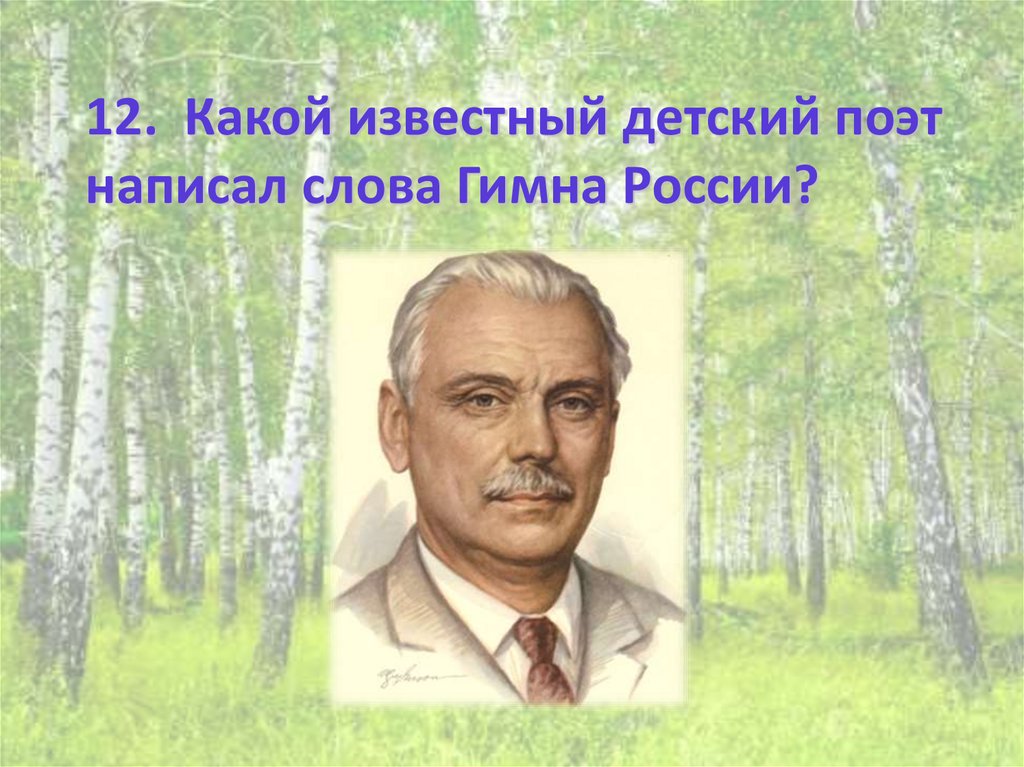 12. Какой известный детский поэтнаписал слова Гимна России?