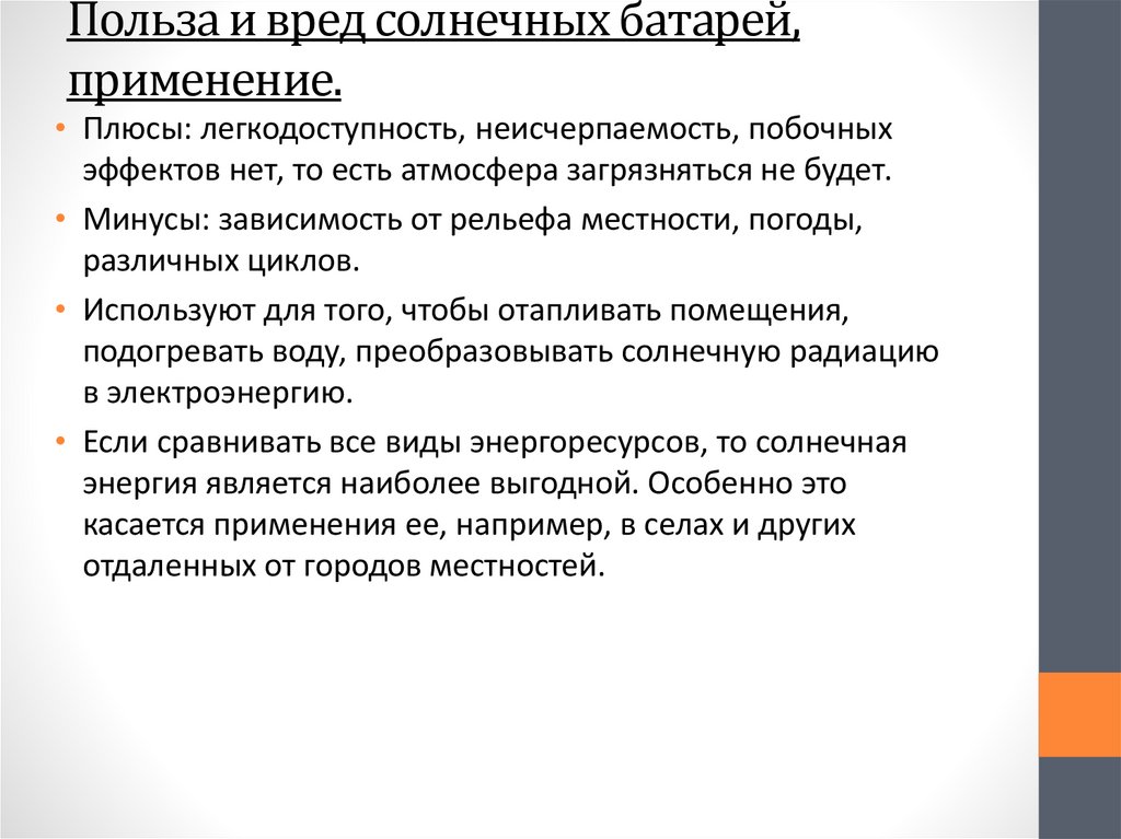 • Если сравнивать все виды энергоресурсов, то солнечная
