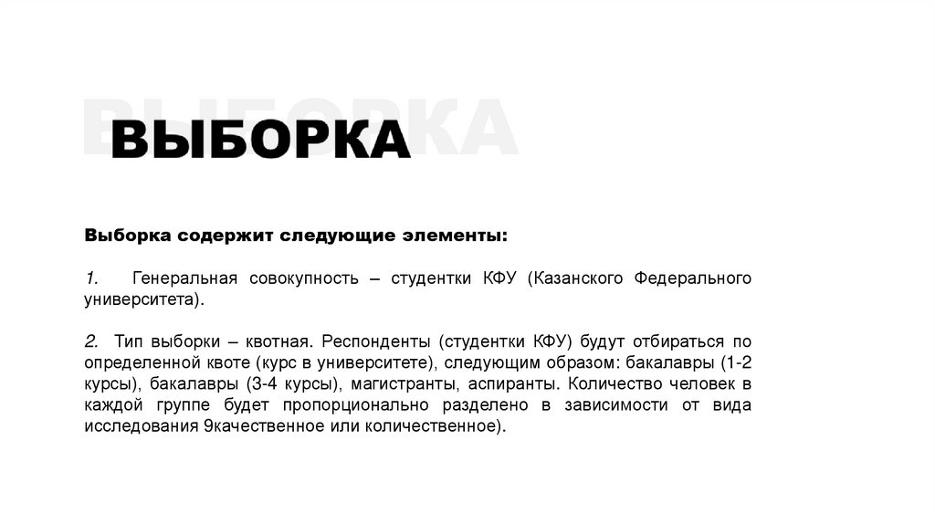 2. Тип выборки – квотная. Респонденты (студентки КФУ) будут отбираться по