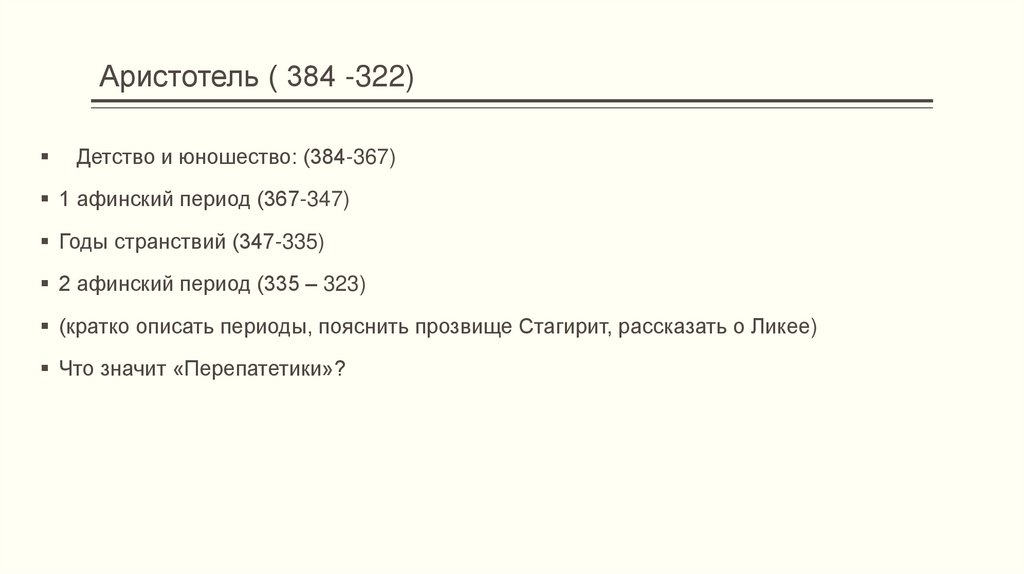 (кратко описать периоды, пояснить прозвище Стагирит, рассказать о Ликее)
