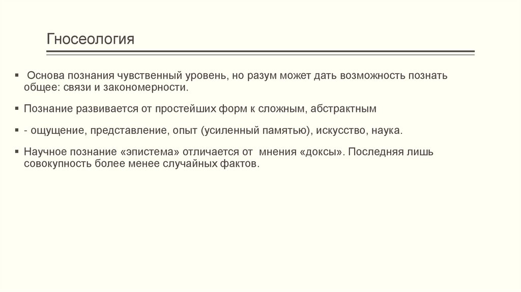 ГносеологияОснова познания чувственный уровень, но разум может дать возможность познать
