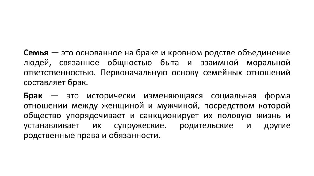Семья — это основанное на браке и кровном родстве объединениелюдей, связанное общностью быта и взаимной моральной