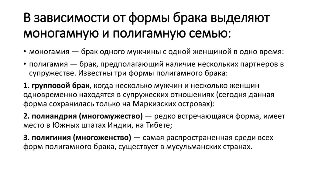 В зависимости от формы брака выделяютмоногамную и полигамную семью:
