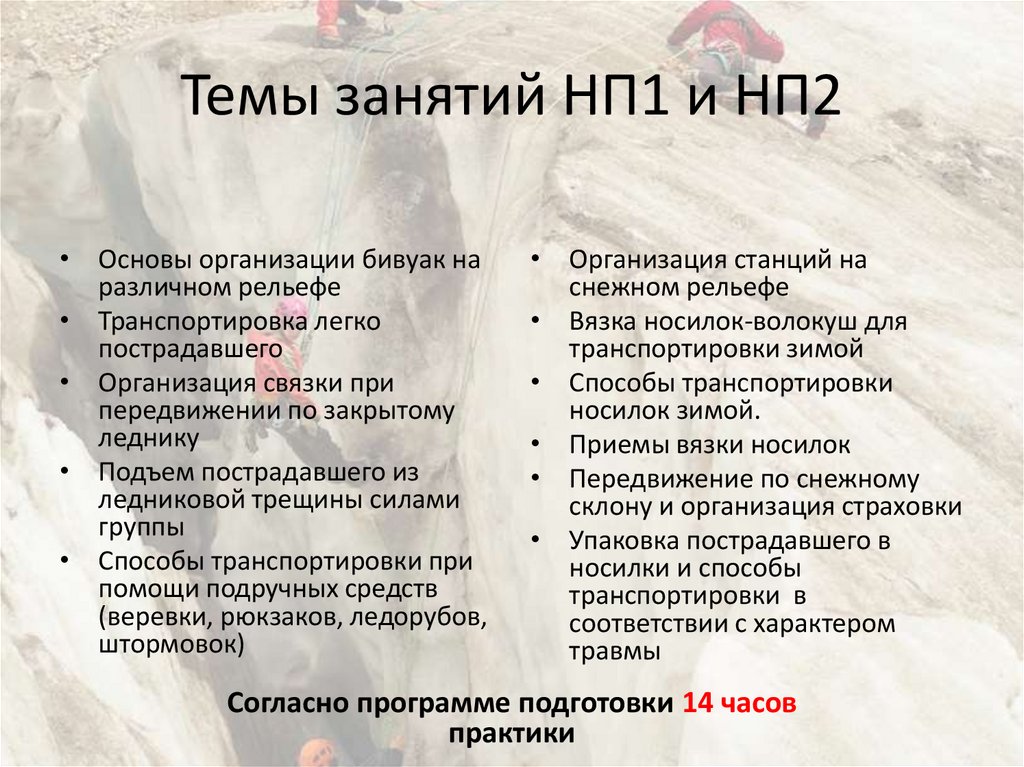 Темы занятий НП1 и НП2• Основы организации бивуак на