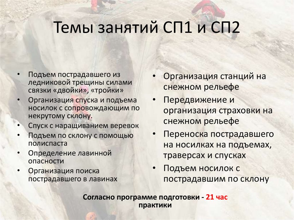 Темы занятий СП1 и СП2• Подъем пострадавшего из