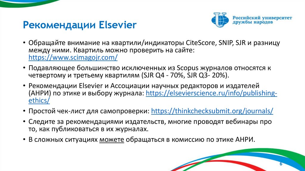 • Рекомендации Elsevier и Ассоциации научных редакторов и издателей