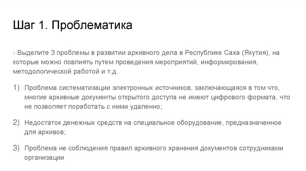Шаг 1. Проблематика- Выделите 3 проблемы в развитии архивного дела в Республике Саха (Якутия), на