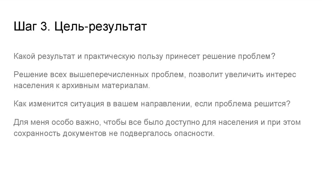Шаг 3. Цель-результатКакой результат и практическую пользу принесет решение проблем?