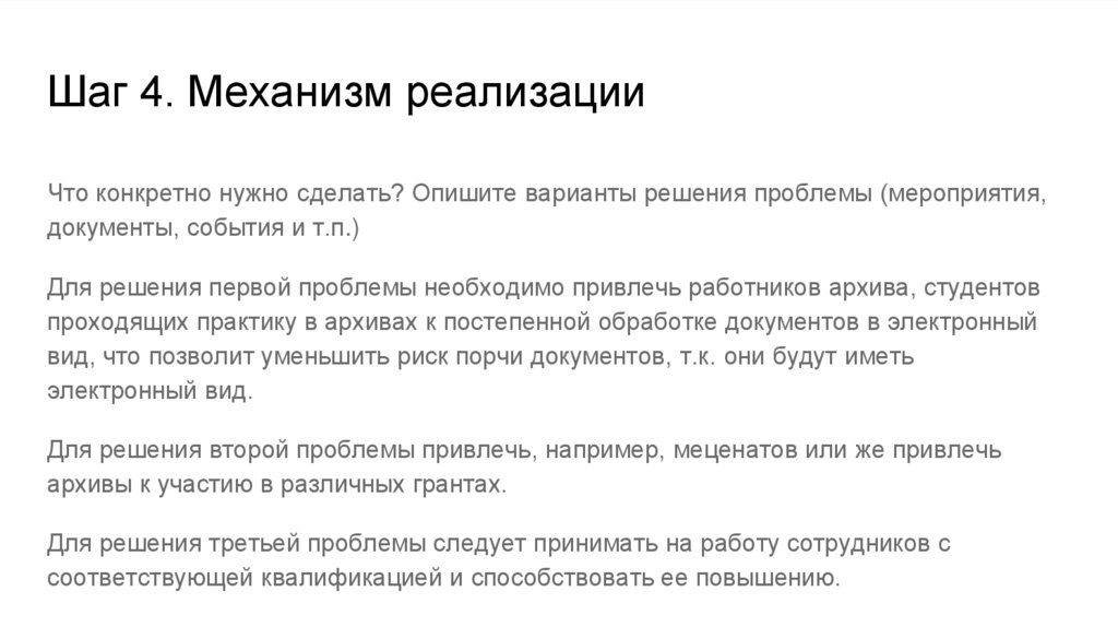 Шаг 4. Механизм реализацииЧто конкретно нужно сделать? Опишите варианты решения проблемы (мероприятия,