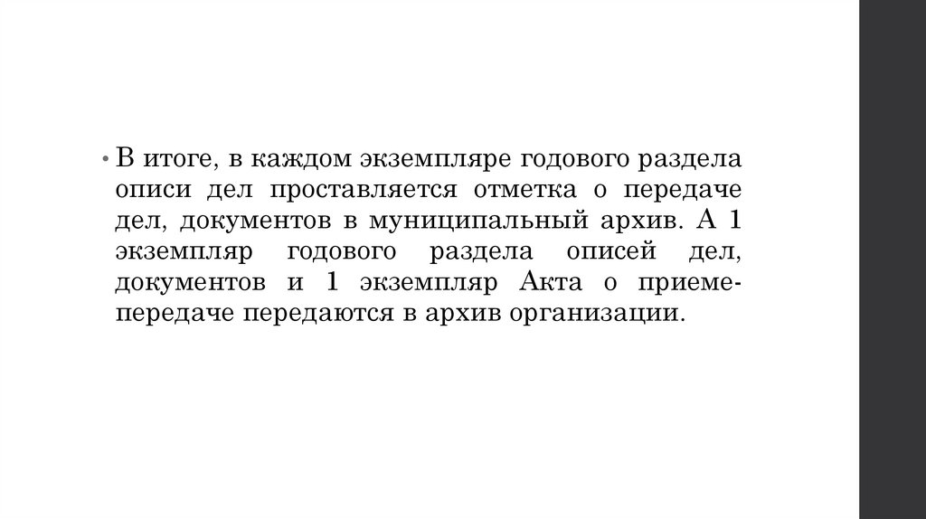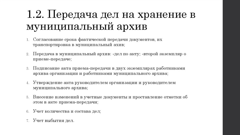 Передача в муниципальный архив: -дел по акту; -второй экземпляр о